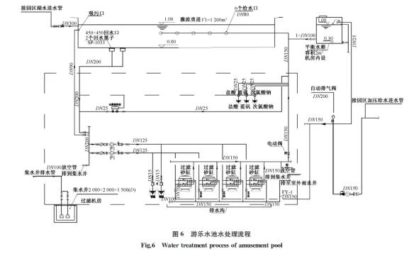 游乐水池水处理流程参照顺流式游泳池设计,并根据是否与人体直接接触确定水质标准。水景池、部分游乐水池利用与人工湖换水方保持水质。田美河取水泵房如图4所示,人工湖水处理流程如图5所示,游乐水池水处理流程如图6所示。
